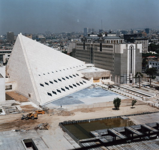 بدنه این ساختمان مربع مربع است. و به نظرم این می تونه نماد صحفه شطرنجی باشه (از نماد های بسیار مهم ماسون ها). به علاوه اینکه پنجره های به کار رفته مربع های سیاه هستند و بدنه سفید.
